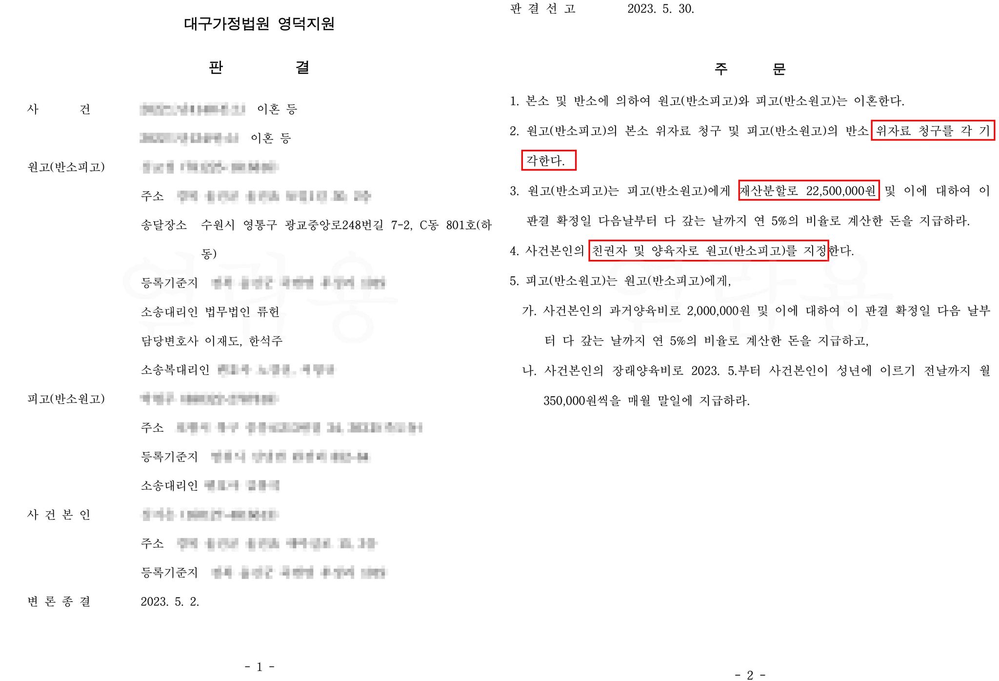 위자료 청구는 쌍방 모두 기각되었고, 상대의 재산분할 청구금액을 1/3 가량 감액하였으며, 양육권을 지킬 수 있었습니다.