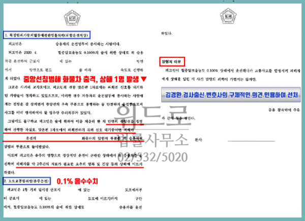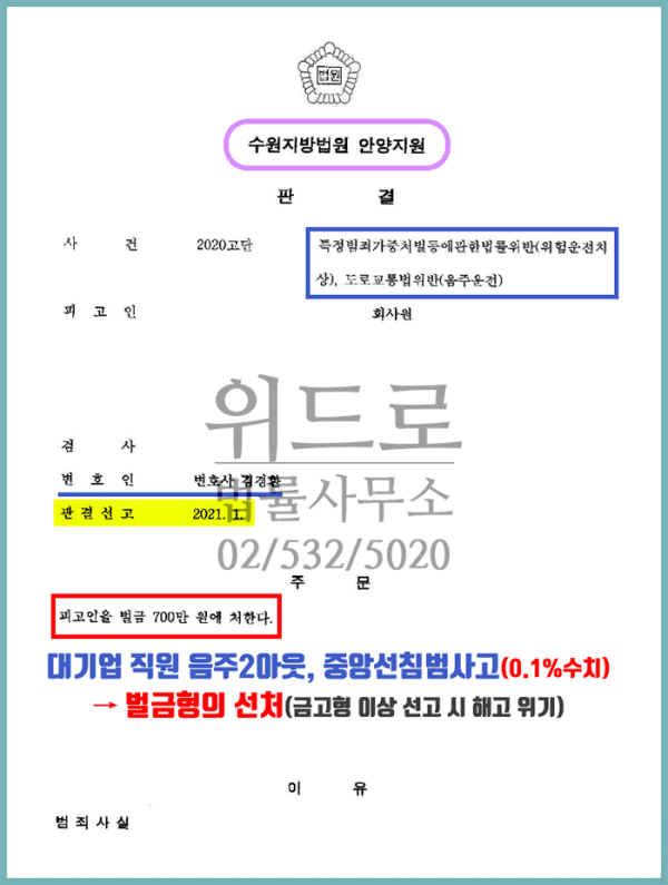이 부분은 김경환 변호사의 조력으로 검찰단계에서 무혐의 처분이 났으며, 나머지 음주2아웃 인피사고로 정식재판을 받은 결과, 징역형 선고 확률이 매우 높았던 상황에서 판사님이 김경환변호사의 의견을 참작하여 벌금형의 매우 유리한 선처를 결정. -> 벌금형의 선처로 해고 면한 의뢰인(취업규칙 상 형사처벌에서 금고형/징역형 집행유예 이상 선고시 해고)