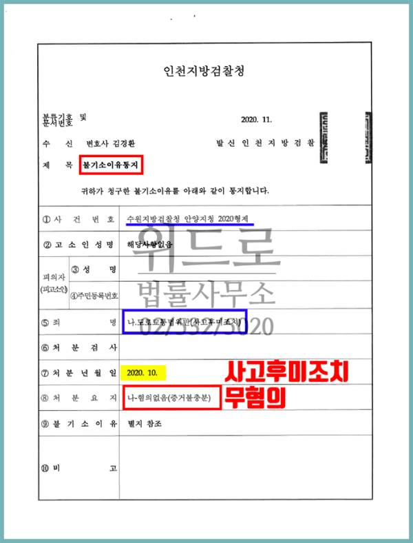 처분결과 : 벌금형의 선처/사고후미조치 무혐의 처분