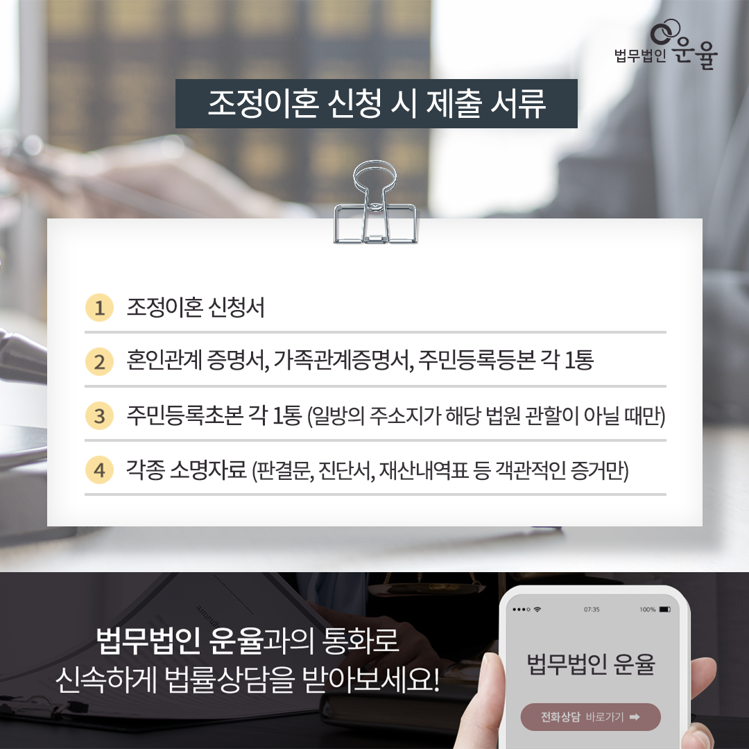이혼상담변호사의 조력으로 이혼조정을 신청할 때는 신청인, 피신청인, 신청 취지 신청원인 등 기재한 신청서와 혼인관계증며서, 등본, 가족관계증명서 등을 가정법원에 제출해야 합니다.