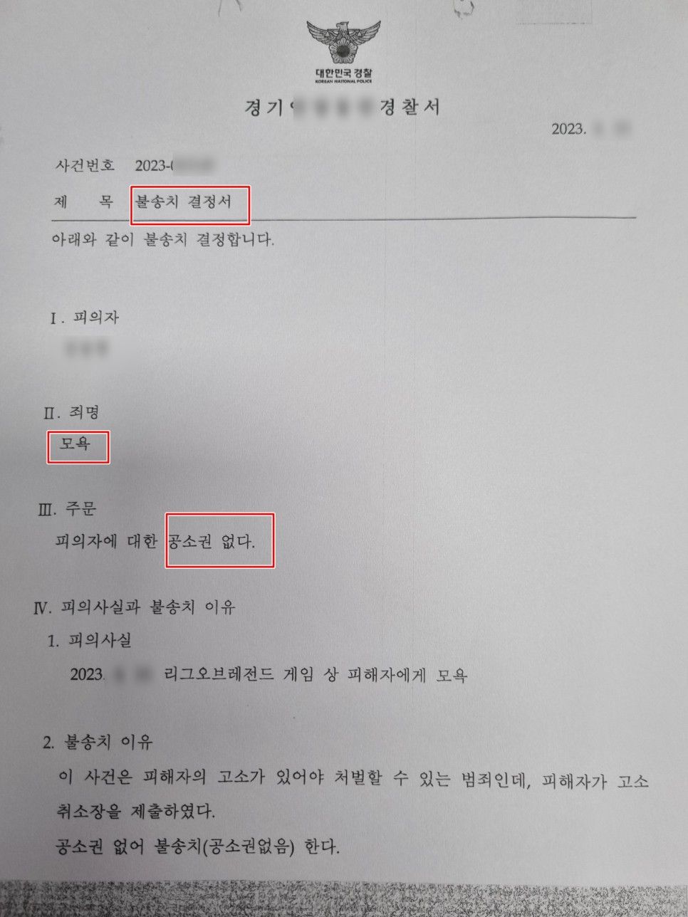 오늘은 리그오브레전드 게임을 하던 의뢰인이 같은 팀 플레이어에게 심한 욕설을 하여 모욕죄로 고소당한 사건에서 경찰단계 공소권없음 처분을 받은 성공사례에 대하여 포스팅하고자 합니다.