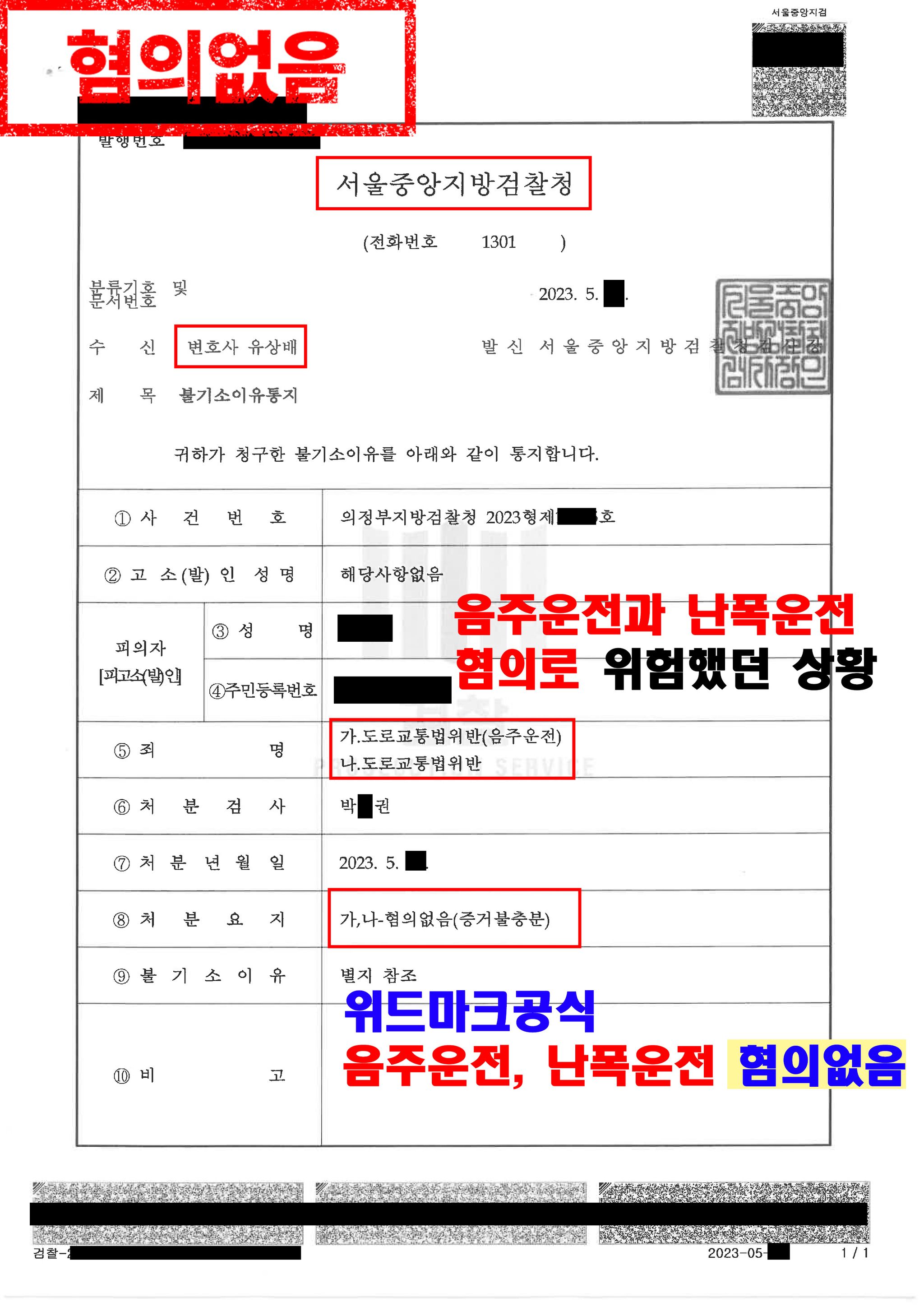 본 변호인의 무혐의 변론에 대하여 수사기관도 심사숙고한 결과, 위드마크공식을 적용하여 의뢰인이 난폭운전 및 음주운전을 하였다는 부분에 대하여 혐의없음 취지의 불송치 결정을 하였습니다.