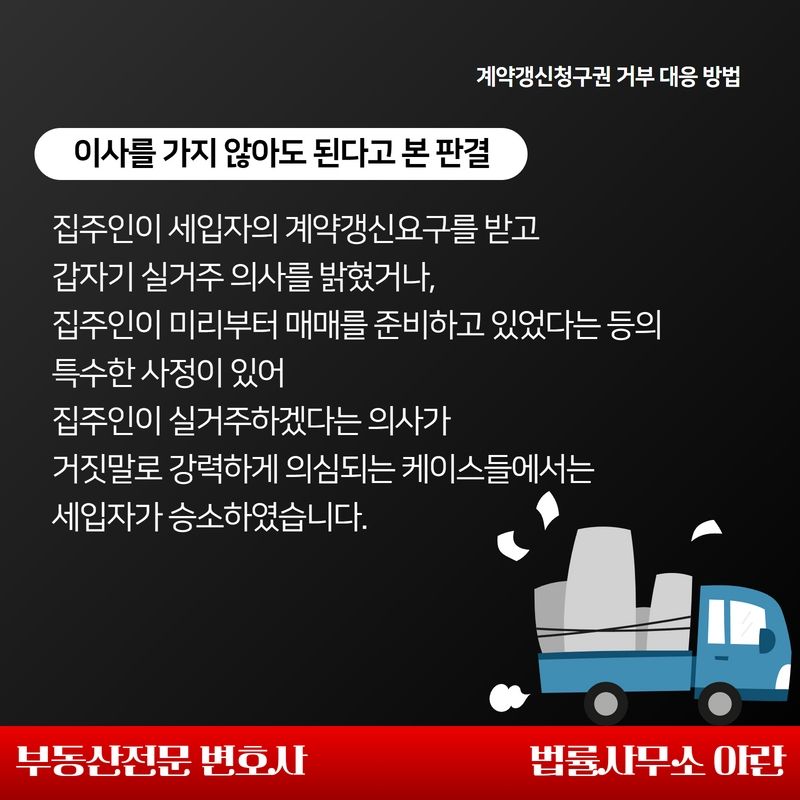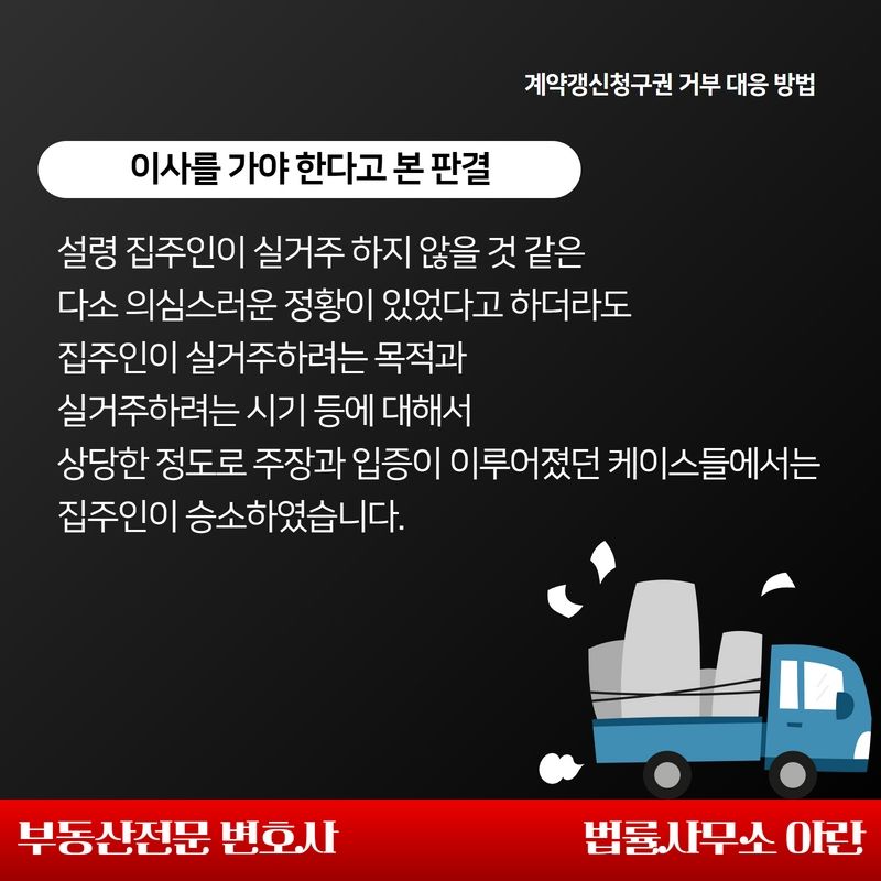위 사건들은 설령 집주인에게 다소간의 의심스러운 정황이 있다 하더라도, 집주인이 실제 들어와서 살려는 목적과 시기 등에 대해 상당한 정도의 주장과 입증이 진행되었던 케이스들이었습니다.