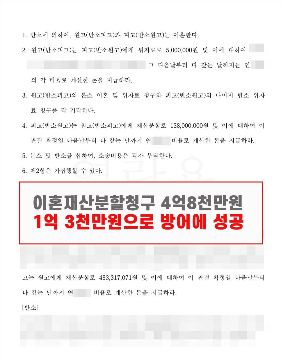 이를 통해 의뢰인은 상대방이 청구한 재산분할금액 4억 8천만원을 1억 3천만원으로 막을 수 있었습니다. 더불어 소송비용도 각자 부담하라는 판결을 얻을 수 있었습니다.