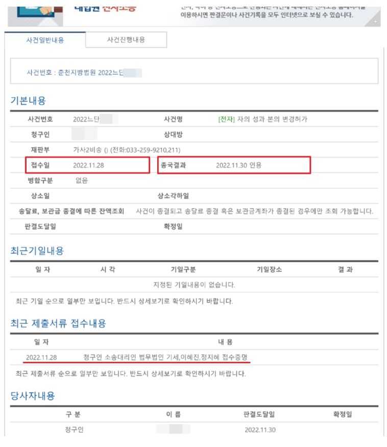 이렇게 단기간에 성본변경 결정까지 받는 것은 결코 흔치 않습니다.