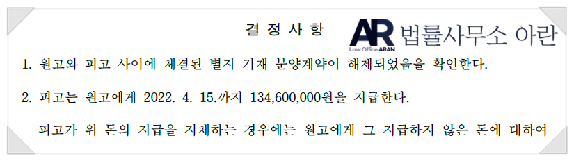 아래 판결은 제가 실제로 수행했던 사건에 관한 판결로서, 타운하우스 분양계약을 체결하였으나 시행사가 사실상 파산하여 공사 진행이 불가능했던 사건입니다. 아래 사건에서 법원은 이행불능으로 인한 분양계약 해제를 인정하고, 시행사는 수분양자로부터 계약금 및 이에 대한 이자 또는 지연손해금을 반환하라는 판결을 선고하였습니다.