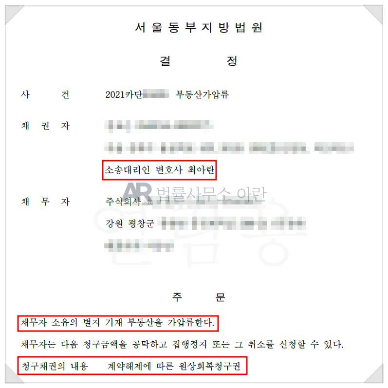 그리고 법원에서는 분양계약 해제에 따른 원상회복청구권을 가압류 청구 채권으로 하여 가압류 결정을 내렸습니다.