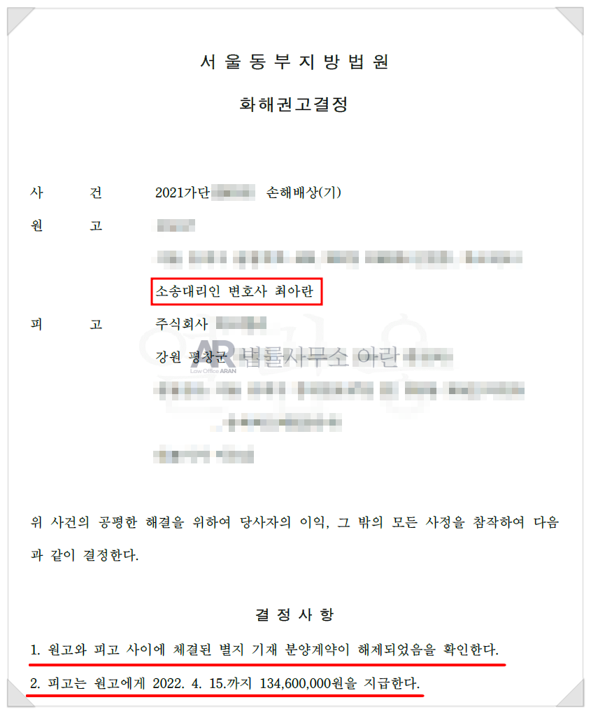 그 결과 법원은 분양계약이 해제되었다는 사실을 확인하면서, 피고가 원고(의뢰인)에게 분양대금 전액을 반환하라는 내용의 화해권고결정을 내렸습니다.