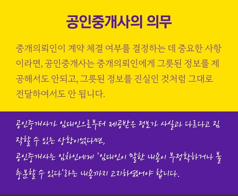 공인중개사는 잘못된 정보를 제공하거나, 잘못된 정보를 진실인 것처럼 그대로 전달해서는 안 됩니다.