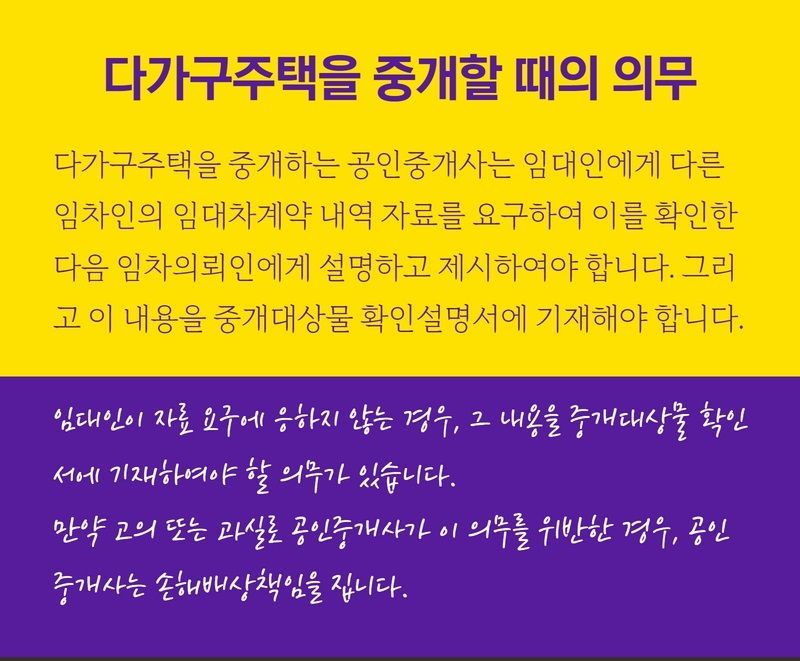 다가구주택인 경우, 공인중개사는 다른 임차인의 임대차 내역을 확인하여 임차인에게 알릴 의무가 있습니다.