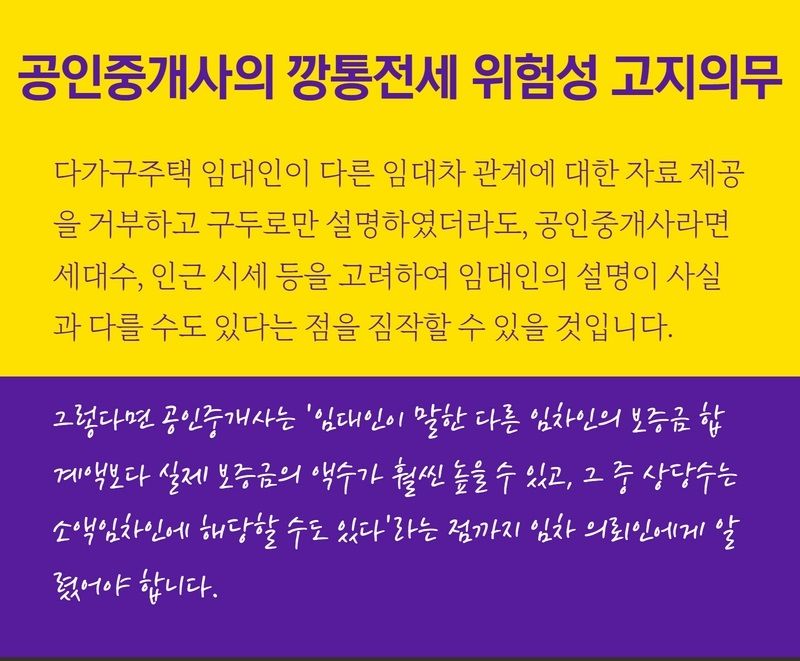 그뿐만이 아닙니다. 공인중개사는 임대인이 자료 제공을 거부하고 구두로만 정보를 제공한 경우, 공인중개사로서는 인근 시세나 해당 다가구주택의 가구 수 등에 미루어 임대인이 제공한 정보에 의문을 가질 수 있습니다. 만약 공인주개사가 의심을 가져야 할만한 정황이 존재함에도 불구하고, 공인중개사가 안이하게 생각하여 임차인에게 '임대인이 구두로 설명한 임대차보증금이 얼마다'라고만 설명하였다면 그 경우에도 공인중개사는 손해배상책임을 집니다.