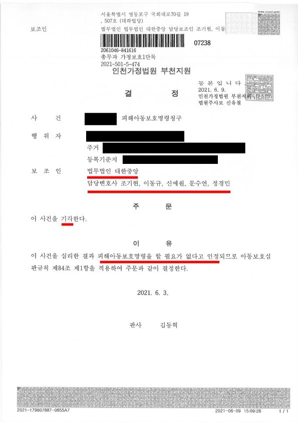 결과적으로 조기현변호사의 주장이 받아들여져서 피해아동보호명령청구기각결정이 내려졌습니다.