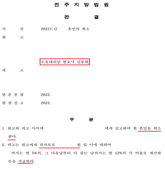 위와 같은 조력 결과, 법원은 상대방이 의뢰인을 기망하여 혼인하였다는 주장을 받아들여 혼인 취소 판결을 선고하였습니다.