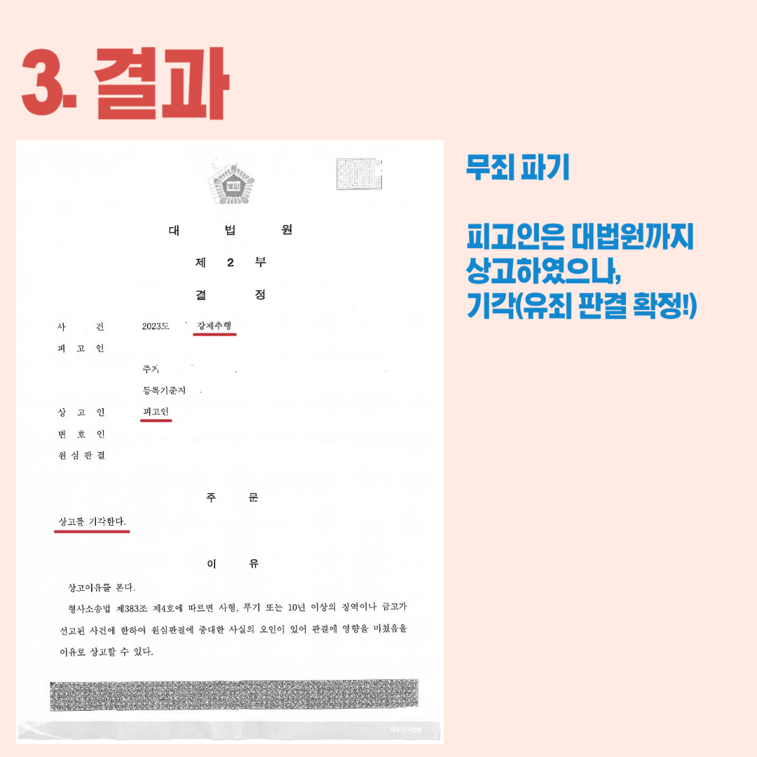 가해자는 뒤집힌 유죄 판단이 억울하다며 대법원까지 상고하였으나, 대법원에서도 피해자의 손을 들어주었습니다.