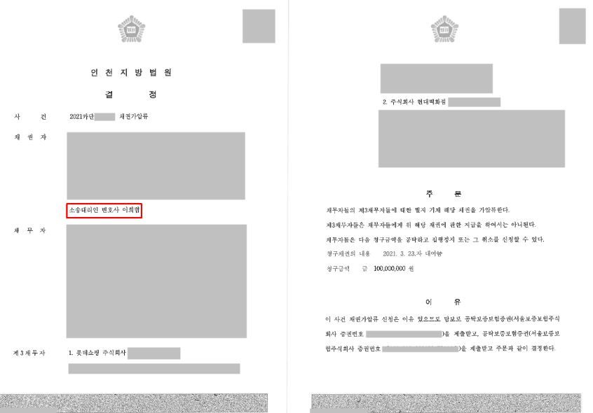 저희 사무실에서는 채권 가압류가 필요한 이유를 소명하여 판사를 설득시켰고 이를 채무자 모르게 비밀리에 은밀하게 진행하여 그 결과 백화점들에 대한 채권 가압류 결정을 단 하루만에 얻어낼 수 있었습니다.