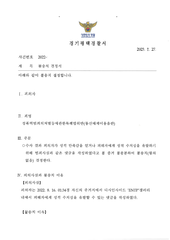 피의자는 디시인사이드 ENTP갤러리에서 고소인과 싸우던 중에 고소인에게 "병신년아 책은 시발 니 보지에 끼우고 딸이나 쳐던가 하고"라는 발언을 하여 통매음으로 형사고소를 당하였고,