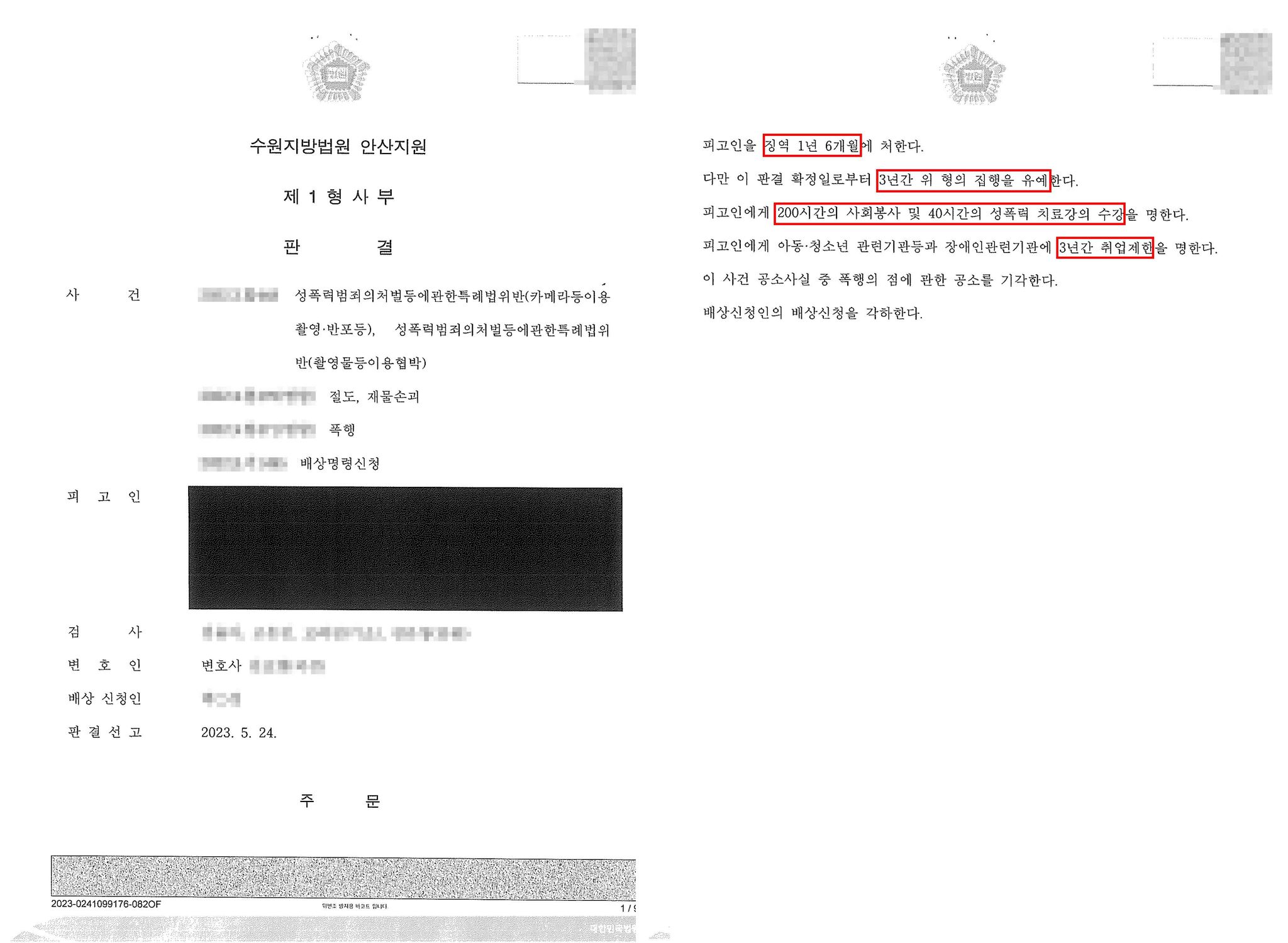 상대방은 징역 1년 6개월, 집행유예 3년, 3년의 취업제한, 200시간의 사회봉사 및 40시간의 성폭력치료 강의 수강 명하는 판결을 선고받았습니다.