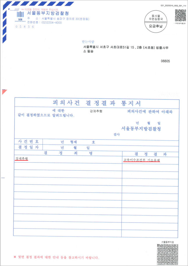 ※ 이에 서울동부지방검찰청은 "기소유예" 처분을 하여 의뢰인님께서는 아무런 전과기록도 남지 않은 사건입니다.
