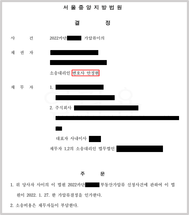 법원은 동생과 동생 회사 소유의 부동산 11개 전부에 대한 가압류신청을 모두 인용해주었습니다.