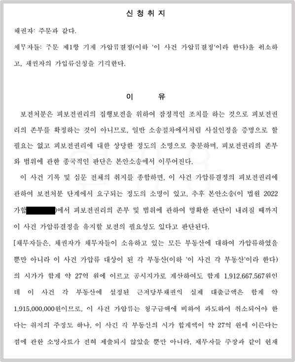 의뢰인의 동생은 부동산가압류로 인해 재산처분이 모두 막히자 법원에 가압류이의신청을 하였는데, 가압류이의 재판에서는 전체부동산에 대한 가압류결정이 유지될 보전의 필요성이 있음을 적극적으로 밝히며 상대방의 이의신청이 모두 기각되도록 하였습니다.