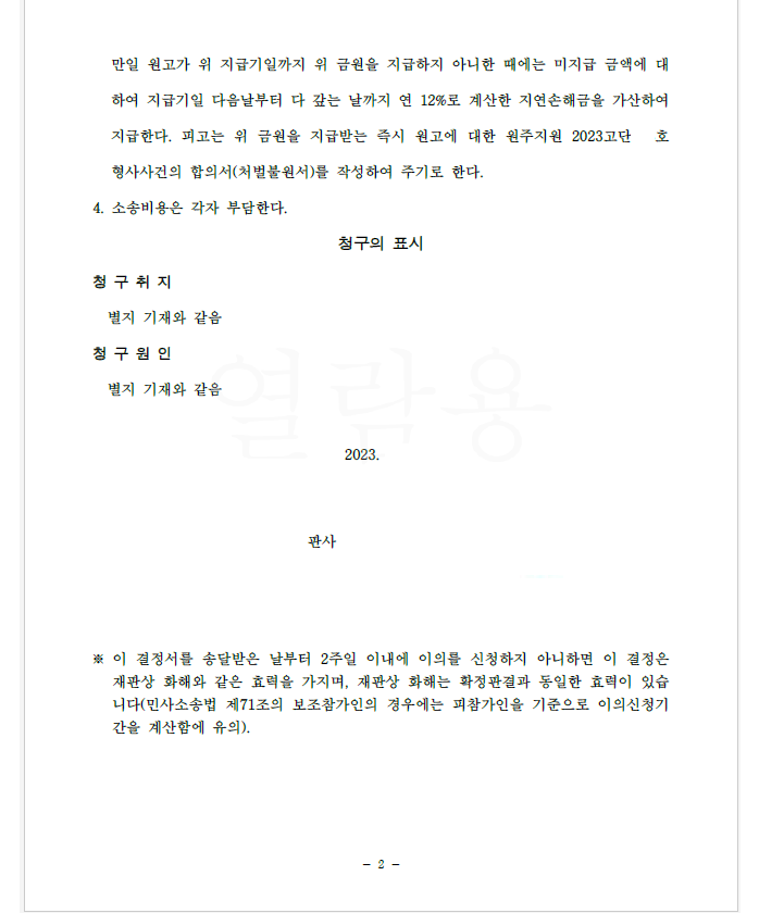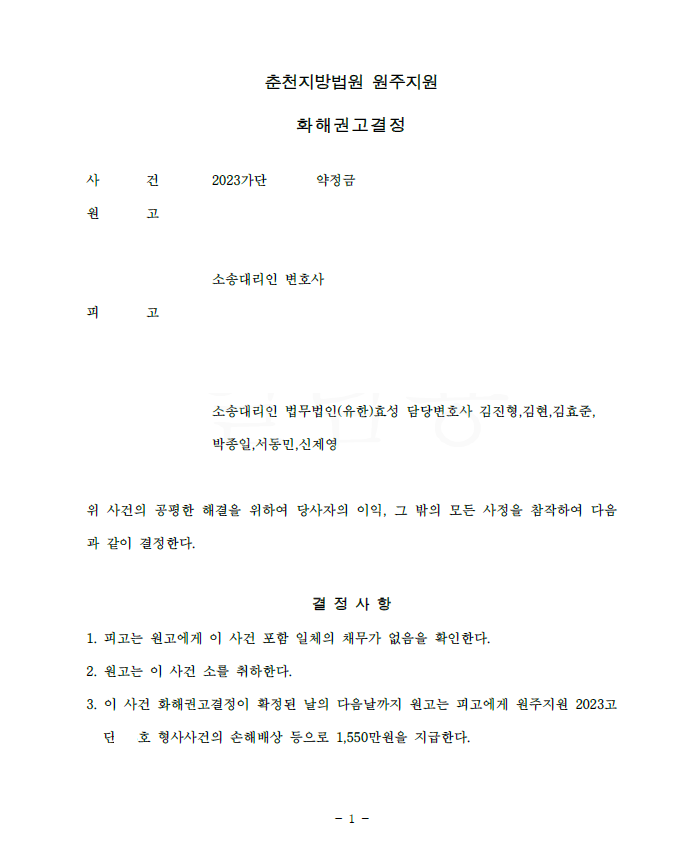 저는 즉각 응소하여 원고의 이 사건 행위는 대여가 아닌 증여임을 주장 입증하였고 법원은 원고가 이 사건 소를 취하하고 오히려 의뢰인에게 손해배상액을 지급하는 내용의 화해권고결정을 내려 확정되어 의뢰인은 채무에서 벗어남과 동시에 손해배상액을 지급받았습니다.