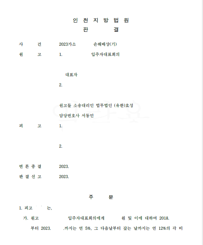피고들은 원고 입대의의 전임 회장 및 총무였는데 재직 중 관리비 등을 개인적으로 유용하였고, 전임 회장은 현 회장인 원고를 폭행 등을 하여 저를 찾아오셨습니다.