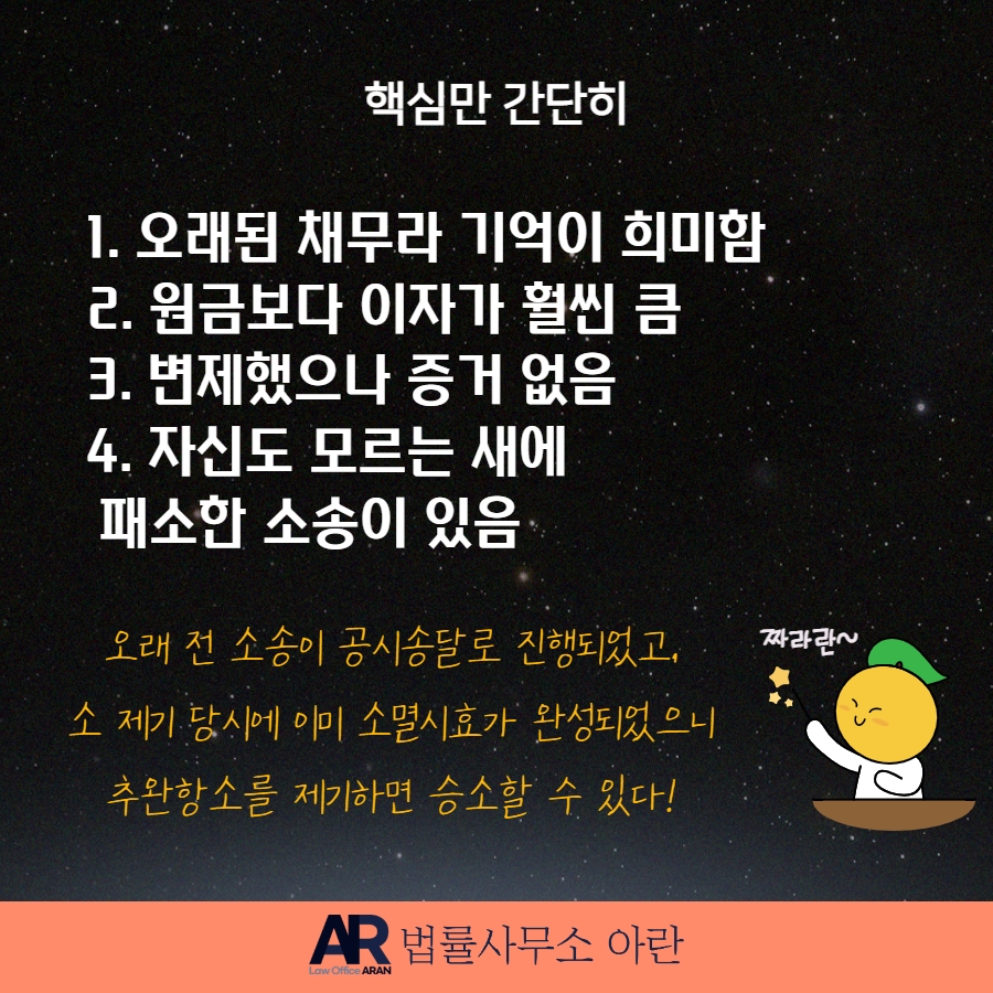 게다가 이 사건에서 문제되는 신용카드 대금은 2000년대 초경에 발생한 것인데, 의뢰인을 향한 소송은 그로부터 5년이 지난 이후에 제기되었으므로 소멸시효 완성을 주장한다면 의뢰인이 승소할 가능성이 매우 높았습니다.