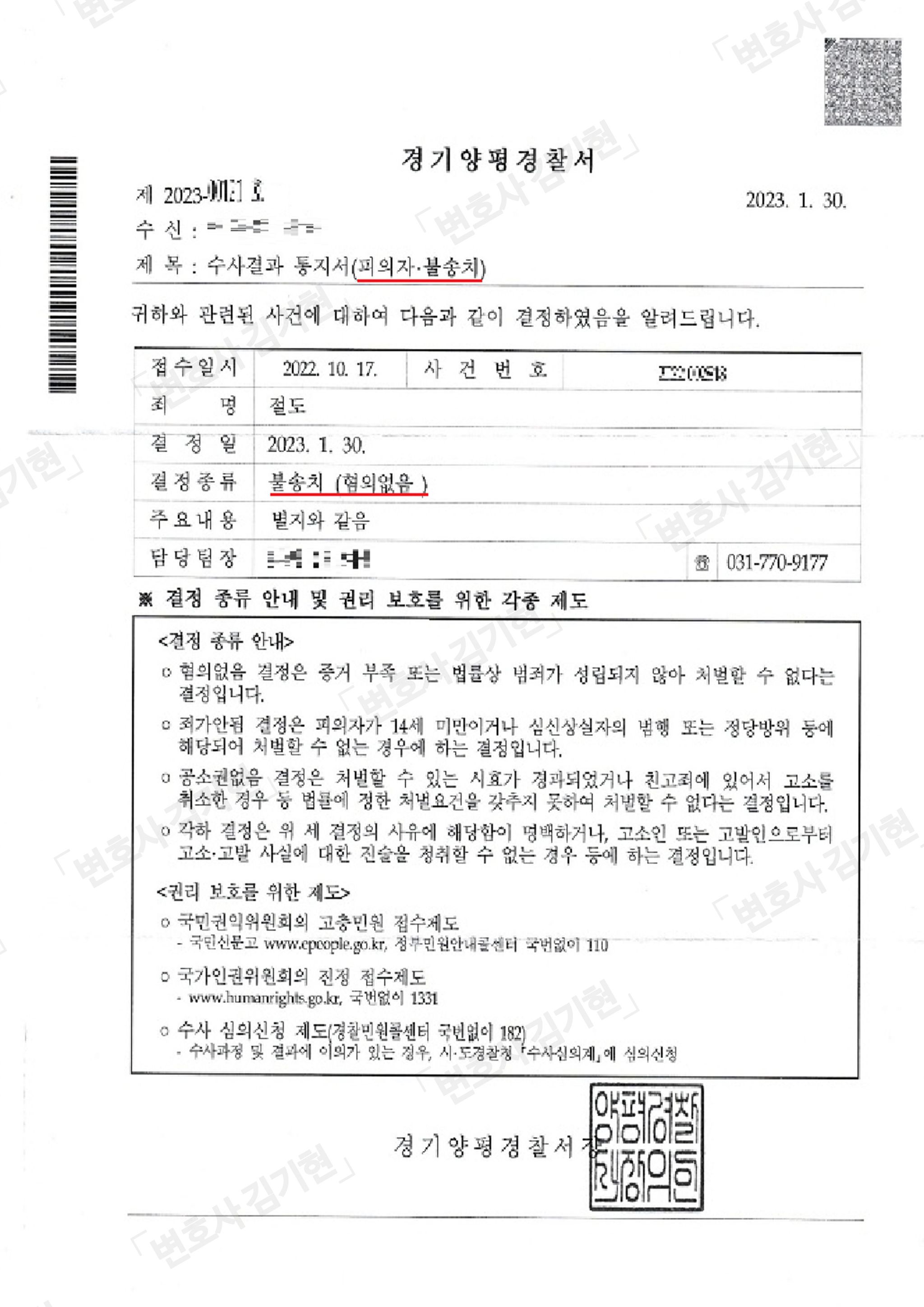 고소인이 주장하는 범행 당시의 의뢰인(피의자) 위치에 대한 증거, 절도라고 주장하는 돈의 출처와 자금 흐름, 이에 대한 금융거래정보제출, 의뢰인이 절도한 돈으로 구매했다고 주장하는 부동산의 계약서와 계약 과정의 참고인 진술을 토대로 무혐의를 받아낸 사건입니다.