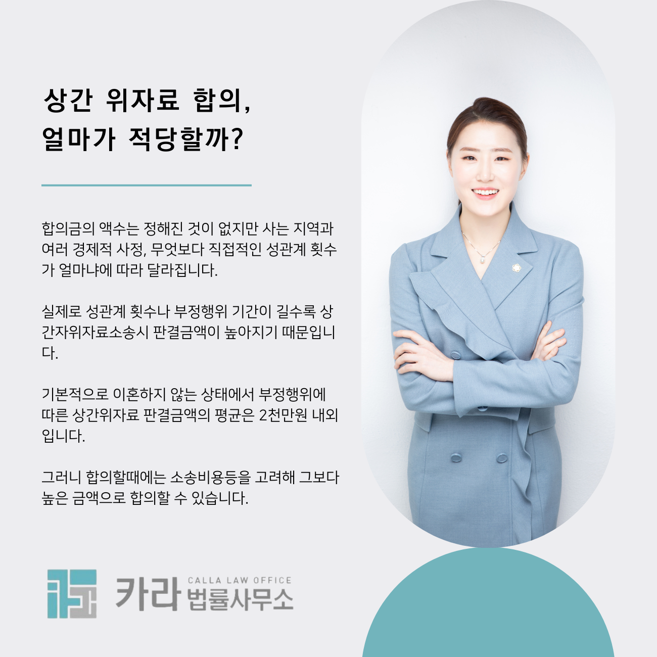이번 시간에는 소송을 하는 대신 상간자와 합의하는 경우 적정한 합의금 액수와 위약벌 조항에 대해 알아보도록 하겠습니다.