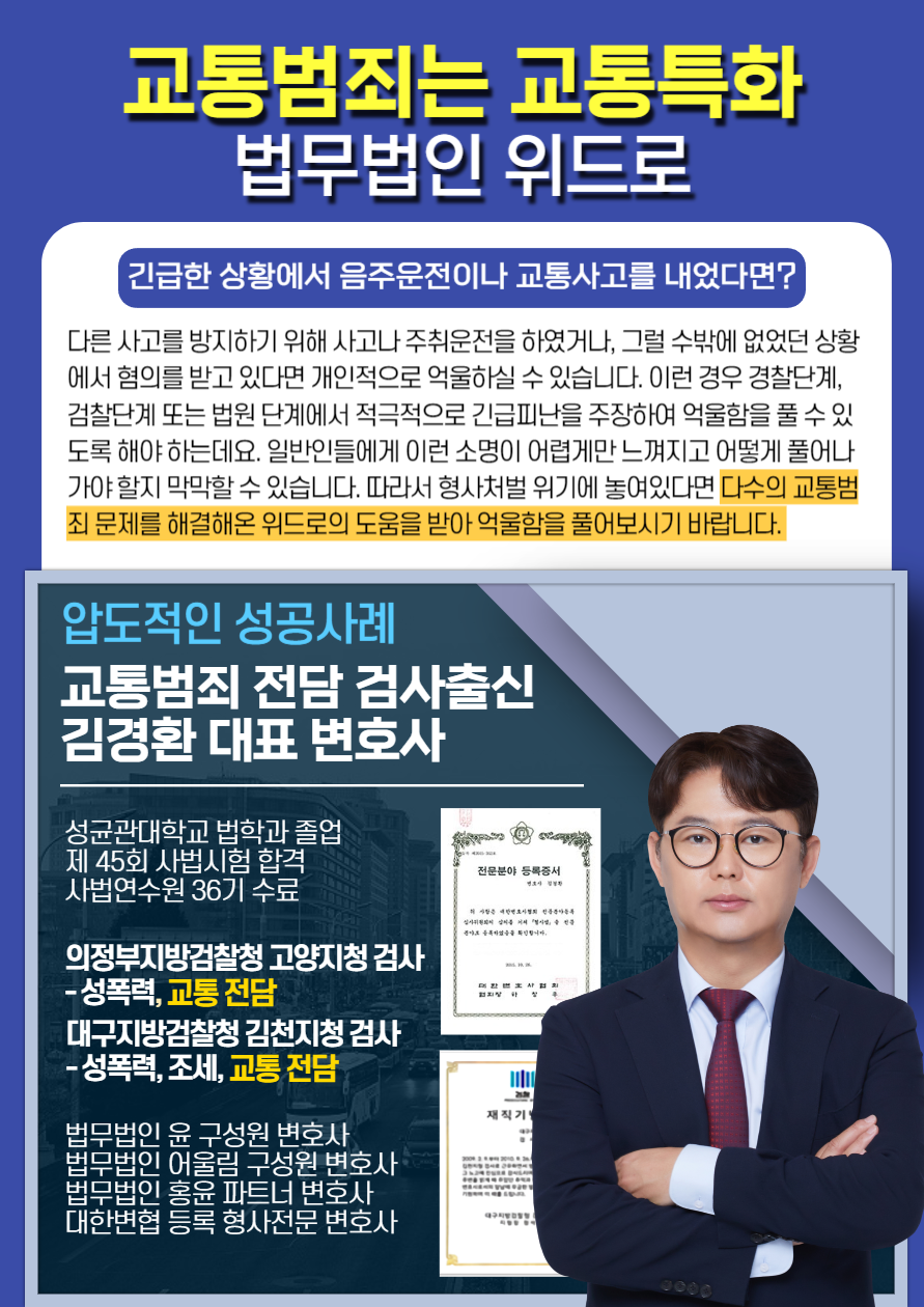 교통범죄로 곤란한 상황을 겪고 계시다면 교통특화 로펌에서 빠르고 철저한 조력을 받아보시는 걸 추천 드립니다.