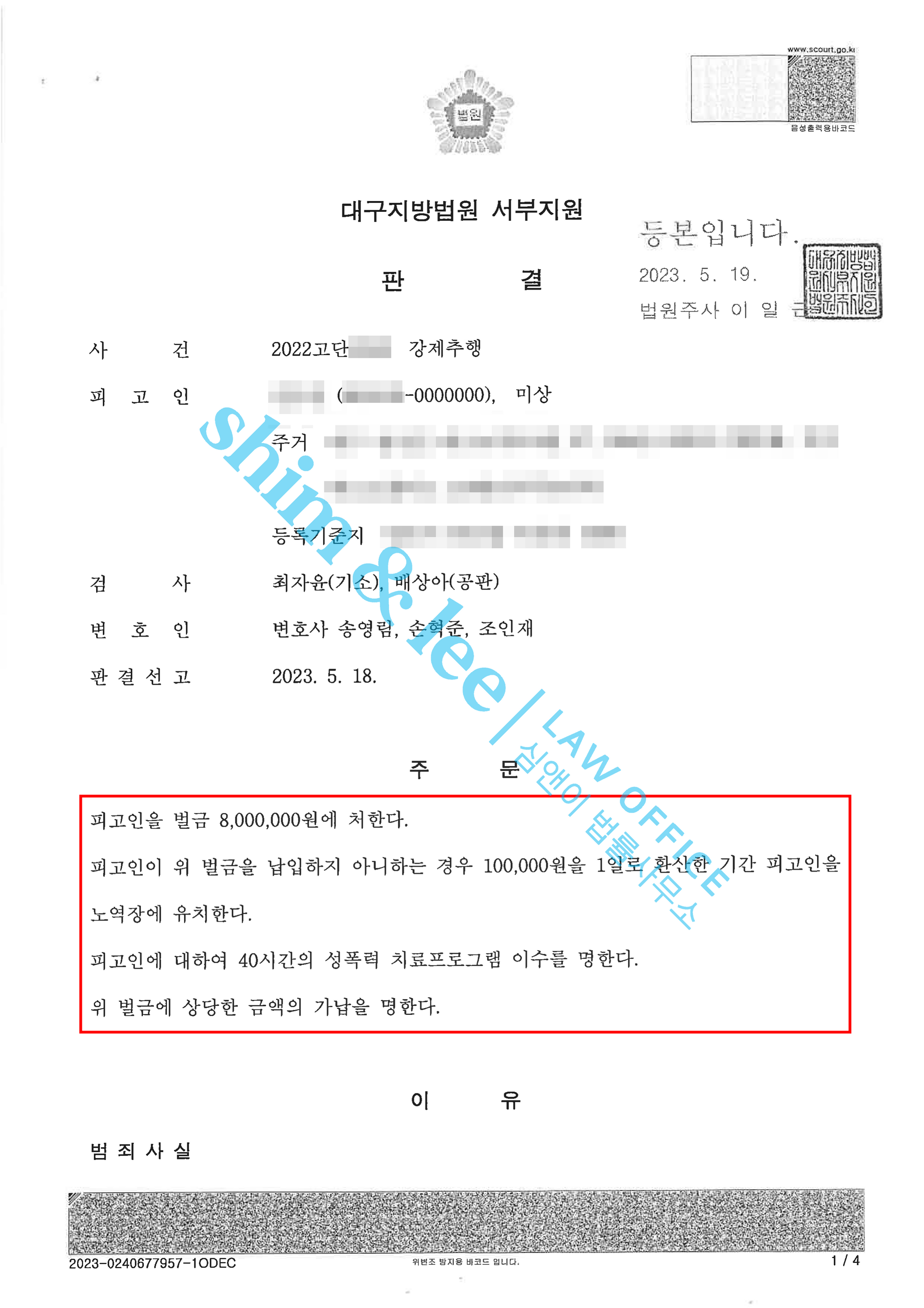 덕분에 경찰 수사관님도 피해자의 진술에 신빙성이 있다고 인정해 주셨고, 자기는 전혀 기억이 나지 않고 만진 적도 없다고 혐의를 전면 부인하는 가해자를 강하게 추궁해서 피해자에게 유리한 방향으로 수사를 진행해 주셨습니다.