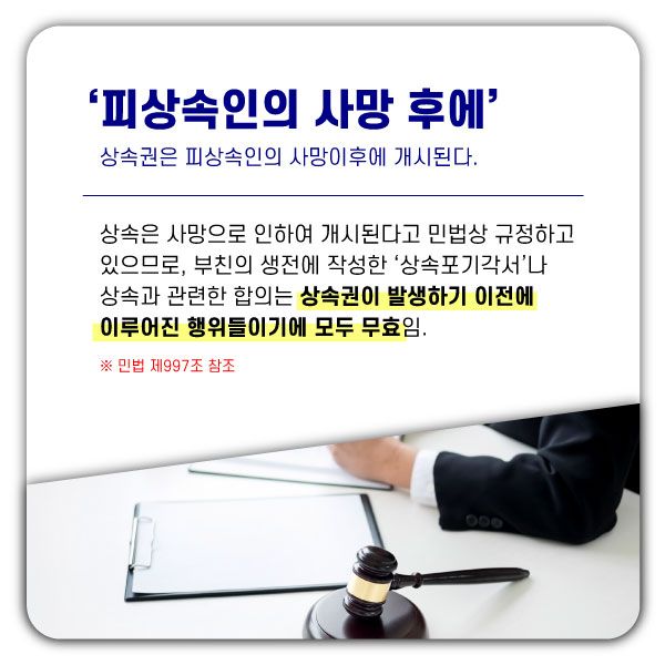 따라서 부친의 생전에는 그러한 상속권이 발생하지 않는 것이고, 상속권이 발생하기도 전에 작성한 '상속포기각서'나 상속과 관련한 합의 등은 모두 무효로써 법적으로 인정받을 수 없습니다.