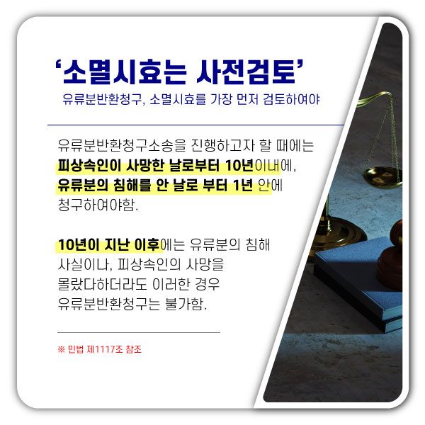 다만, 유류분반환청구는 부친께서 아들에게 모든 재산을 증여하였다는 사실을 딸들이 알게 된 날로부터 1년 안에 그리고 부모님이 돌아가신지 10년 이내에 청구하여야만 유류분을 반환받으실 수 있으므로 유류분반환청구 시 이 소멸시효에 대하여 꼭 유념하시길 바라며, 피상속인 소유의 적극재산이 있는 경우에는 상속재산분할심판과 유류분반환청구소송의 관계에 대해서도 유념하시기 바랍니다.
