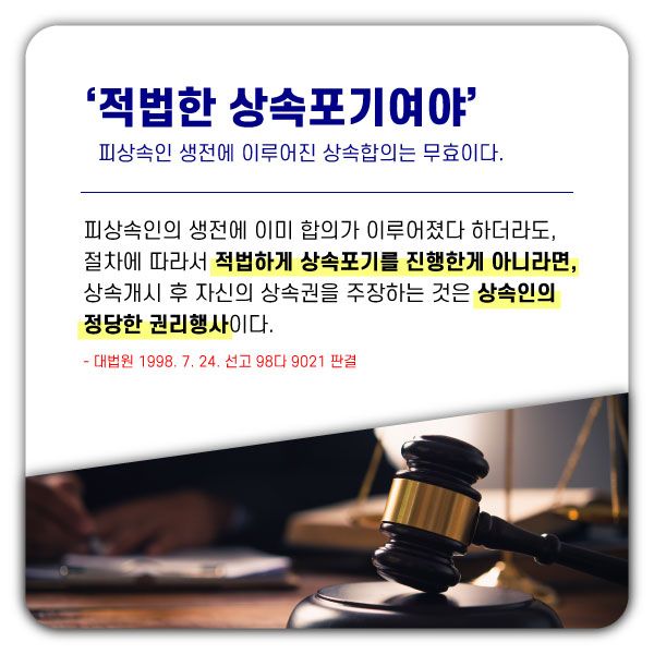 이에 대해서 대법원에서는 “상속인 중의 1인이 피상속인의 생존 시에 피상속인의 재산에 대하여 상속을 포기하기로 약정하였다고 하더라도, 상속개시 후 민법이 정하는 절차와 방식에 따라 적법하게 상속포기를 한 게 아니라면, 상속개시 후에 자신의 상속권을 주장하는 것은 정당한 권리행사로서 권리남용에 해당하거나 또는 신의칙에 반하는 권리의 행사라고 할 수 없다.”라고 판시하였습니다.(대법원 1998. 7. 24. 선고 98다 9021 판결)