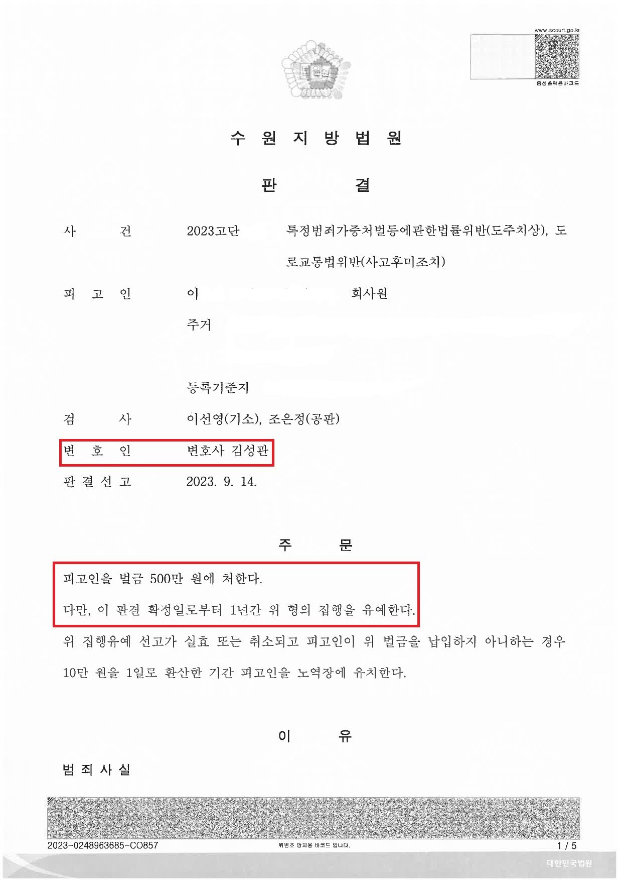 이에 재판부는 본 변호인의 주장을 받아들여, 도주치상죄의 법정 최저형인 벌금 500만원에 집행유예를 선고받게되었습니다. 벌금형의 집행유예의 경우 집행유예기간이 지나면 벌금을 납부하지 않아도 되는 형입니다.