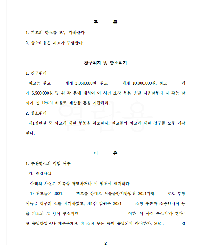 그런데 시간이 지난 후 갑자기 피고는 추완항소를 제기하였고 저는 항소심에서 피고의 추완항소가 부적법함을 주장 입증하여 항소심 법원은 피고 항소를 각하하였습니다.