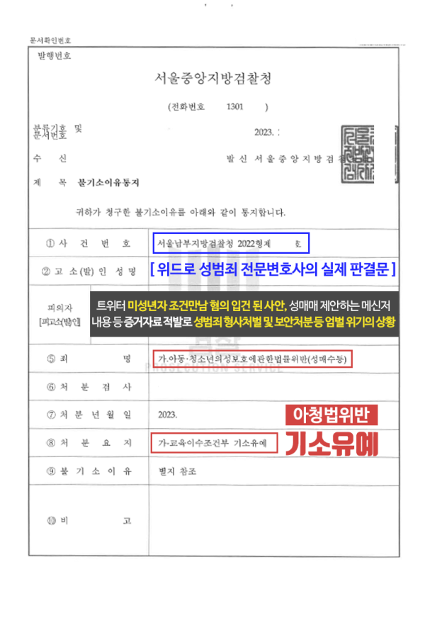 트위터에서 미성년자와 조건만남을 가진 혐의로 입건된 사안으로, 의뢰인이 상대방에게 성매매를 제안하는 등의 채팅 내역을 수사기관에서 확인하여 성범죄 처벌 및 보안처분 위기에 놓여있던 사건입니다.