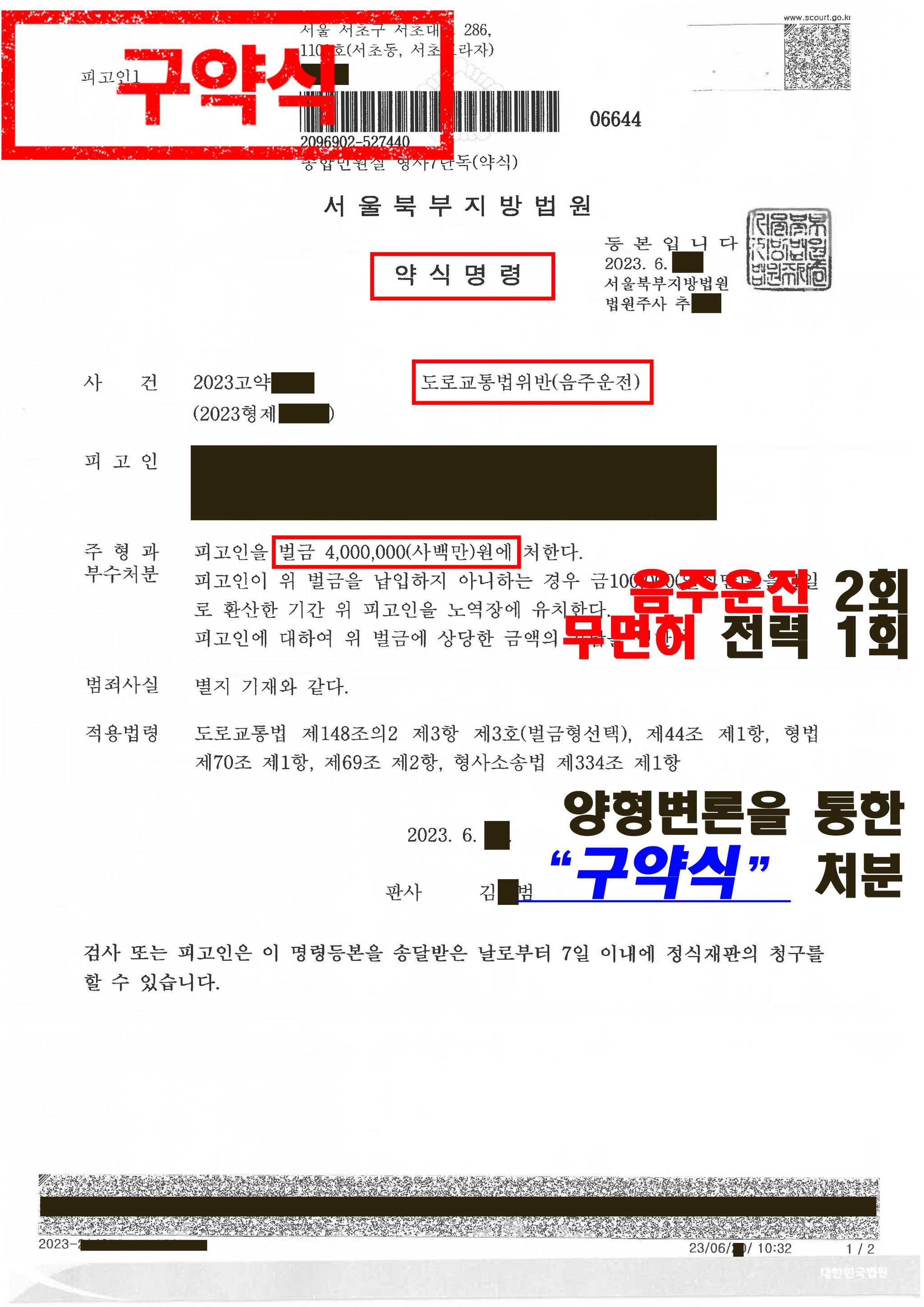 본 변호인은 여러 정상참작자료들과 양형변론을 하였고, 그 결과 담당검사님도 의뢰인의 여러 정상참작자료들을 참작하여 이번에 한해 의뢰인에게 벌금형의 구약식 처분을 내려주었습니다.