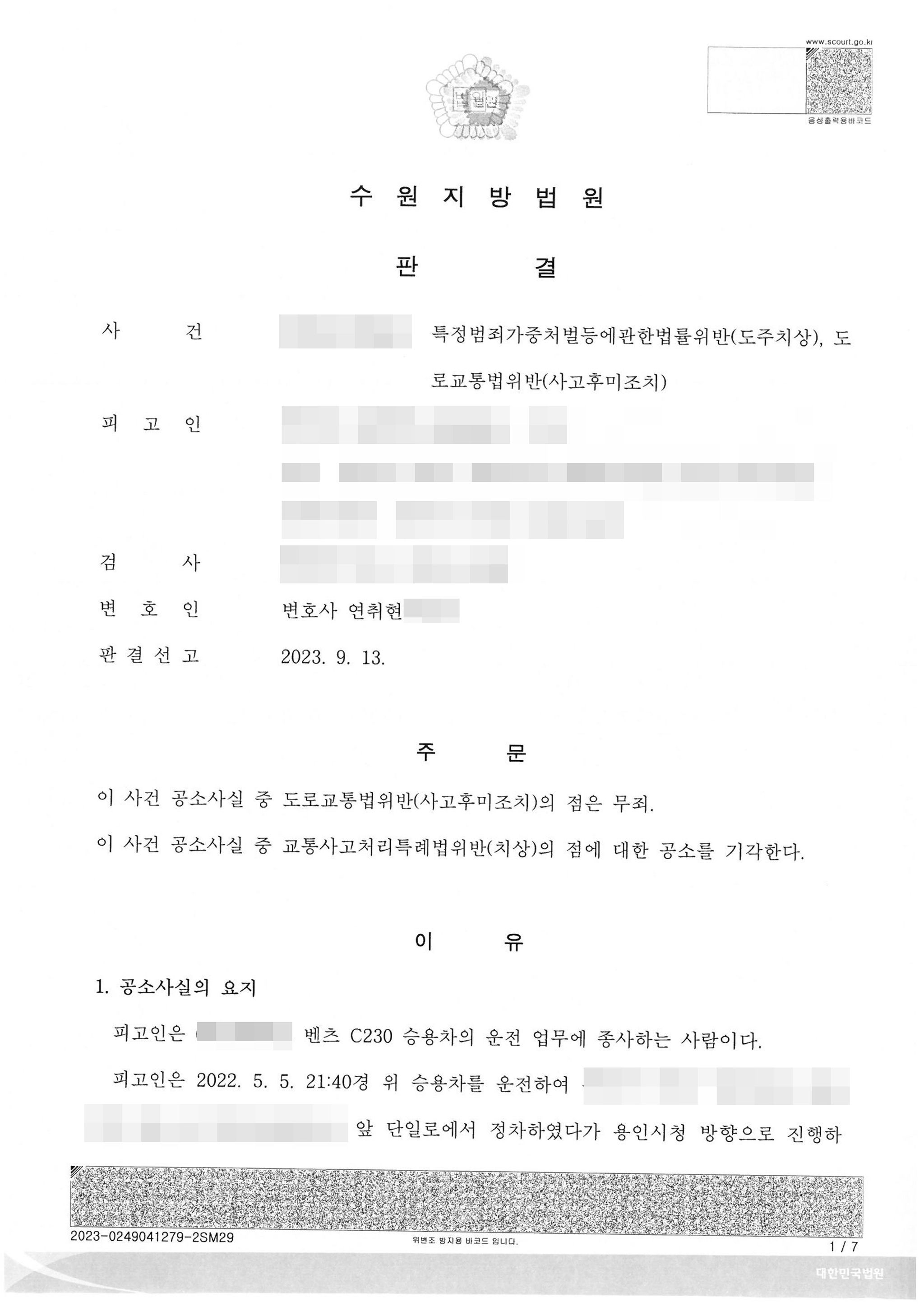 이 사건에서 본 변호인은 피고인은 어둡고 경미하여 현장에서 사고를 인지하지 못하였고, 피해자의 상태가 사고로 인하여 치료를 요하는 정도의 상태가 아니었으며, 사고 후 현장을 이탈한 점은 동승한 지인이 현장에 있었고 집에 급하게 귀가할 이유가 있어서 이며, 도주한 것이 아니라는 점을 적극 변호하였습니다.