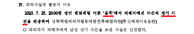 A씨는 2023. 7. 23. 20:00경 랜덤 채팅 어플리케이션 '올톡'에서 전혀 모르는 사람 B씨와 대화하던 중 갑자기 성기 사진을 전송하였습니다.