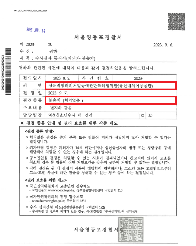 이러한 저의 조력을 바탕으로 A씨는 비록 B씨와의 채팅 내역 등 어떠한 증거도 확보하지 못하였음에도 불구하고 '불송치(혐의없음)' 결정을 받음으로써 섣불리 대응하였다면 얼마든지 될 수 있었던 성범죄자가 될 위기에서 벗어날 수 있었습니다.