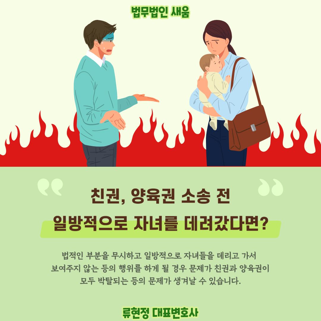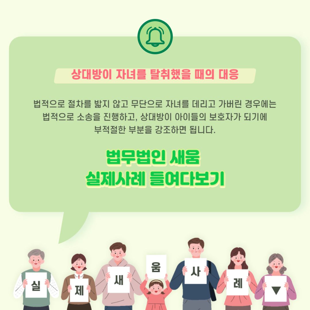 법적으로 절차를 밟지 않고 무단으로 자녀를 데리고 가버린 경우에는 법적으로 소송을 진행하고 상대방이 아이들의 보호자가 되기에 부적절한 부분을 강조하면 됩니다. 법무법임 새움을 찾아오신 의뢰인 A씨도 이혼소송 중 황당한 일을 겪었으나 안정적인 대처를 통해서 오히려 전화위복의 기회로 삼을 수 있었습니다.