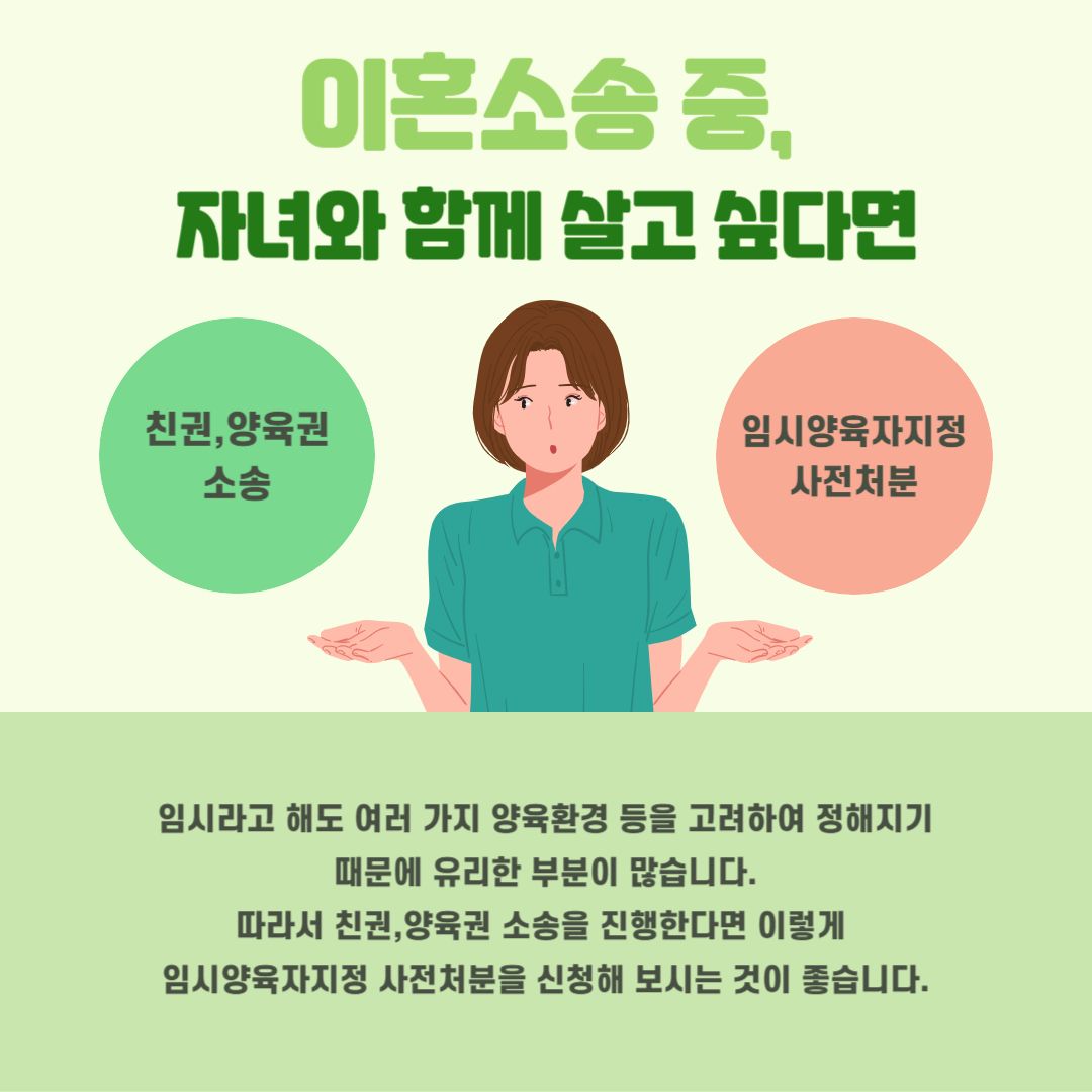가정에 문제가 생긴 이후 자녀와 함께하며 꾸준히 동거를 하고 있을 경우 친권,양육권 소송에서 유리한 부분이 많아질 수 있습니다. 하지만 그렇다고 하여도 무작정 데리고 가는 경우 앞서 언급한 바와 같이 처벌을 받게 되거나 소송에서 불리해질 수 있습니다. 따라서 임시양육자지정 사전처분을 신청한 후 데려올 수 있도록 해야 합니다. 이 제도는 양방이 모두 자녀와 함께 살고 싶어하는 상황에서 본격적인 판결이 내려오고 사건이 끝날 때까지 누가 양육할 것인지를 법원에서 임시로 지정해주는 것을 말합니다. 임시라고 해도 여러 가지 양육환경 등을 고려하여 정해지기 때문에 유리한 부분이 많습니다. 따라서 친권,양육권 소송을 진행한다면 이렇게 임시양육자지정 사전처분을 신청해 보시는 것이 좋습니다.