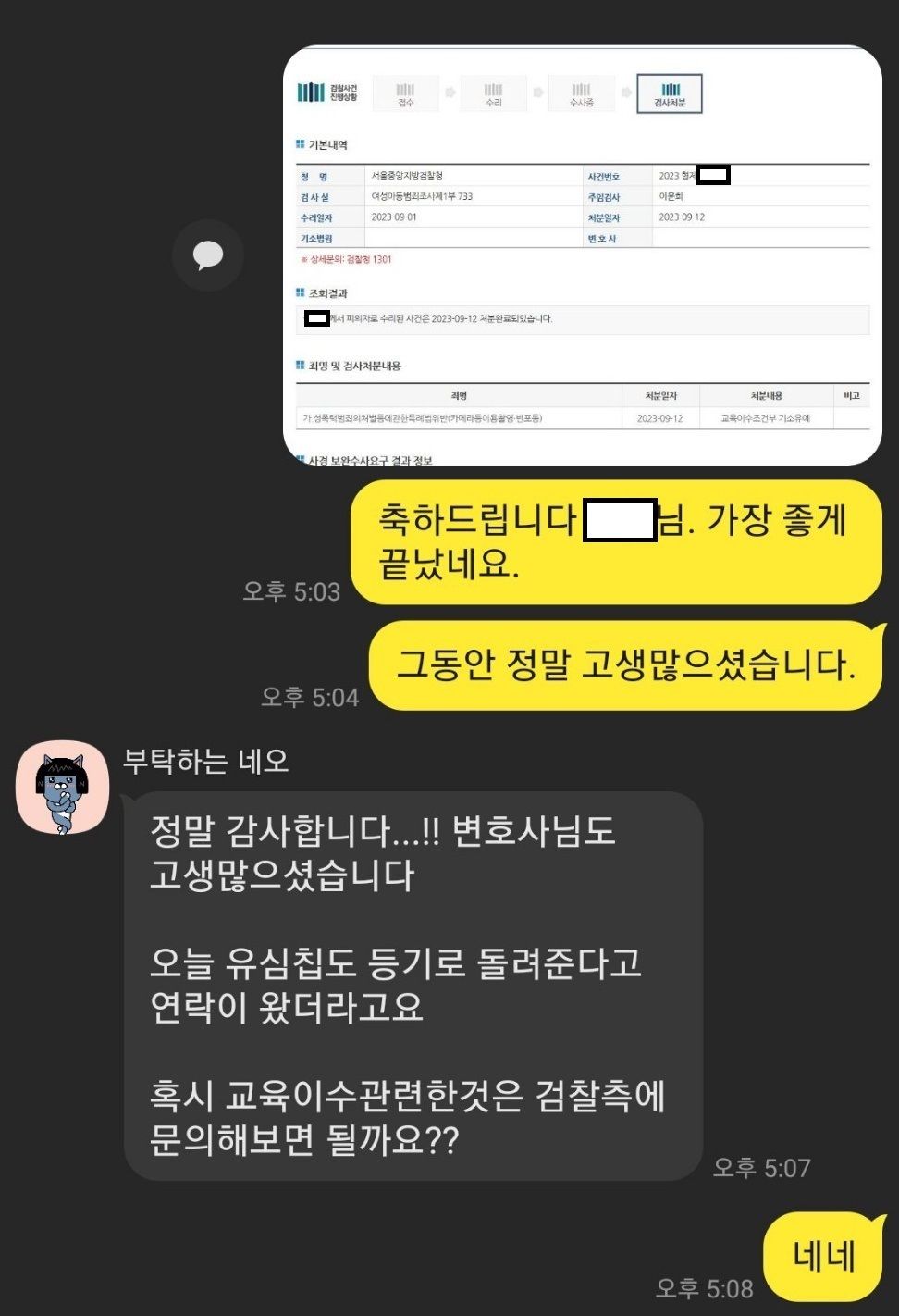그 결과 이 사건은 < 교육조건부 기소유예 > 로 종결될 수 있었습니다.