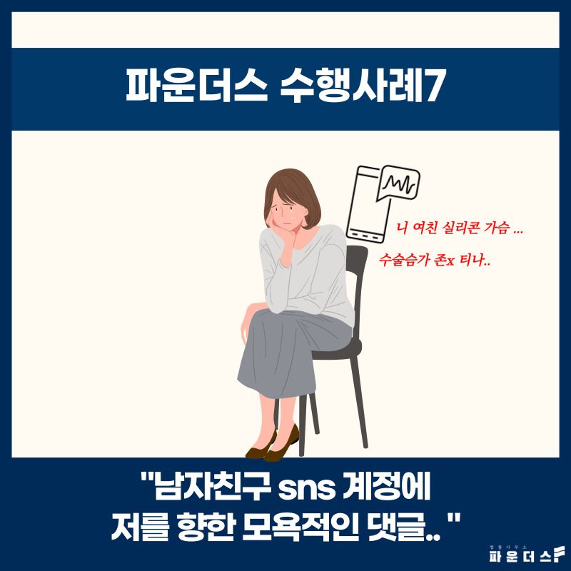의뢰인(고소인) 상대여성 A 씨(피고소인)은 고등학교 동창이었습니다. A 씨는 의뢰인에 악의적인 마음을 품고 여러 아이디로 SNS 계정을 만들었고 개설한 계정들로 의뢰인의 남자친구 계정에 의뢰인을 향한 조롱과 비하의 내용이 섞인 댓글을 작성하였습니다. 해당 댓글 일부를 공개하자면 “니여친 실리콘 가슴 겁내 딱딱 …”, “수술슴가 겁내 티남ㅋㅋㅋ” 등의 내용이었습니다. A 씨가 작성한 댓글은 명백히 A 씨를 향한 악의적이고 자극적인 내용이 주가 된 것으로 비난의 의도가 분명하였으며 다수가 볼 수 있는 의뢰인의 남자친구 계정에 지속적으로 작성한 것으로 의뢰인의 명예를 훼손한 점이 분명한 상황이었습니다.