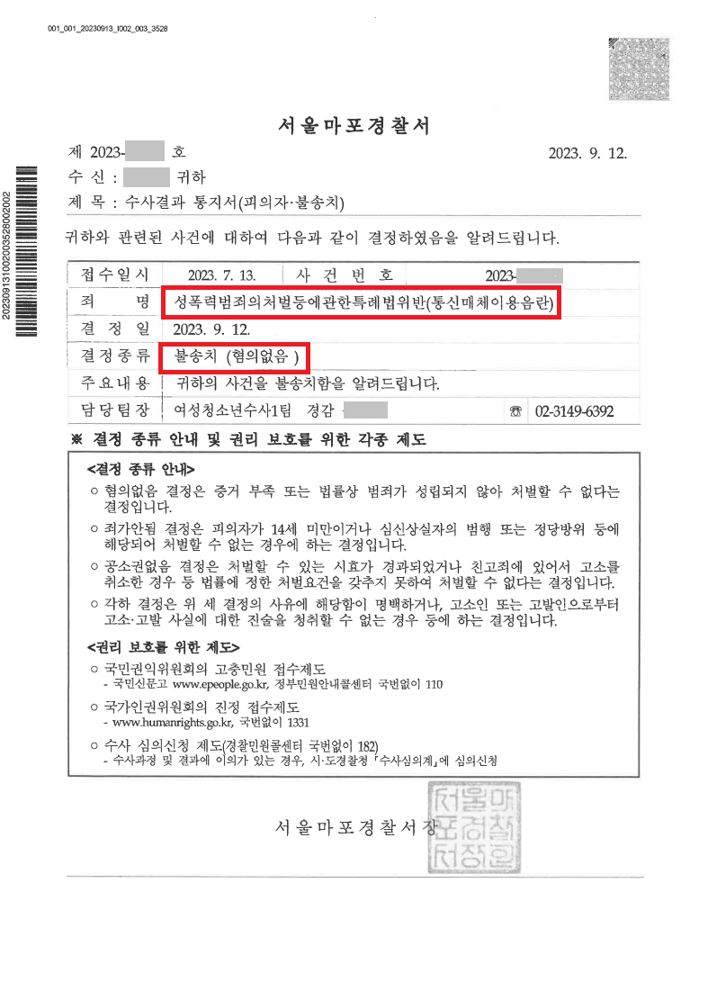 그 결과 아래와 같이 이 사건은 경찰단계에서 불송치로 종결되실 수 있었습니다.