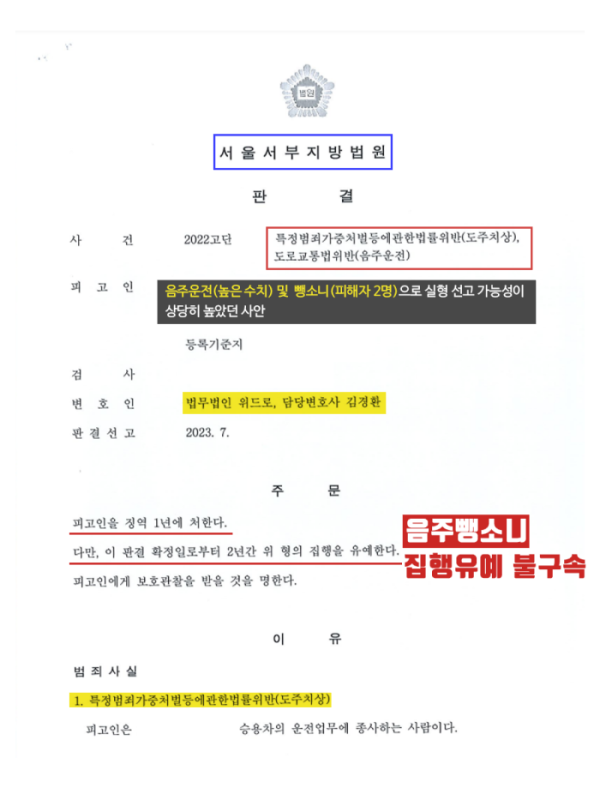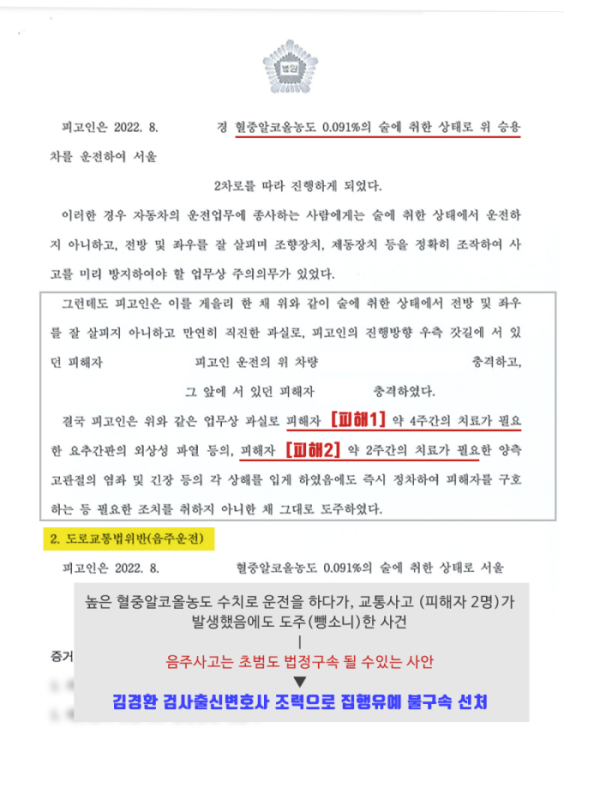 면허취소 수치의 음주운전을 하여 1차 사고를 발생케 하였고,연달아 행인까지 충격하는 2차 사고까지 내어서 사안이 중한데, 아무런 조치 없이 뺑소니까지 하여서 실형을 선고받을 가능성이 매우 높았는데요. 거기다 피고인이 공소장을 송달받은 이후에 법원 재판에 출석하지 않아 구속영장이 발부되어 구속된 사안입니다.