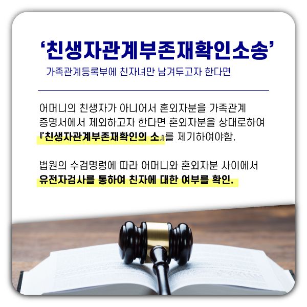 따라서 위와 같이 어머니께서 ‘친생자관계부존재확인의소’를 제기하는 것이 가장 현명한 방법입니다.