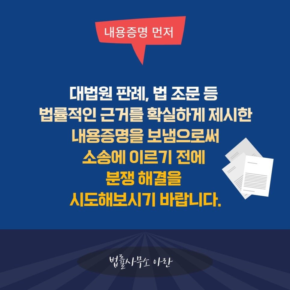 그리고 이때 보내시는 내용증명에는 대법원 판례, 법 조문 등 법률적인 근거를 확실하게 제시하셔야 소송에 이르기 전에 분쟁을 해결하실 수 있습니다.