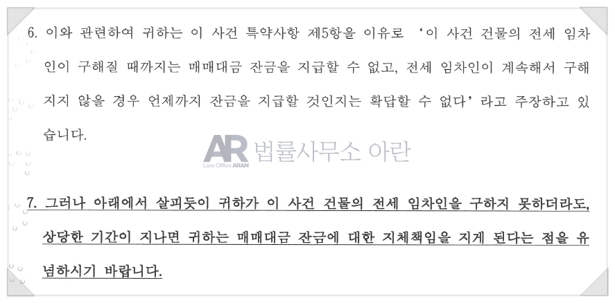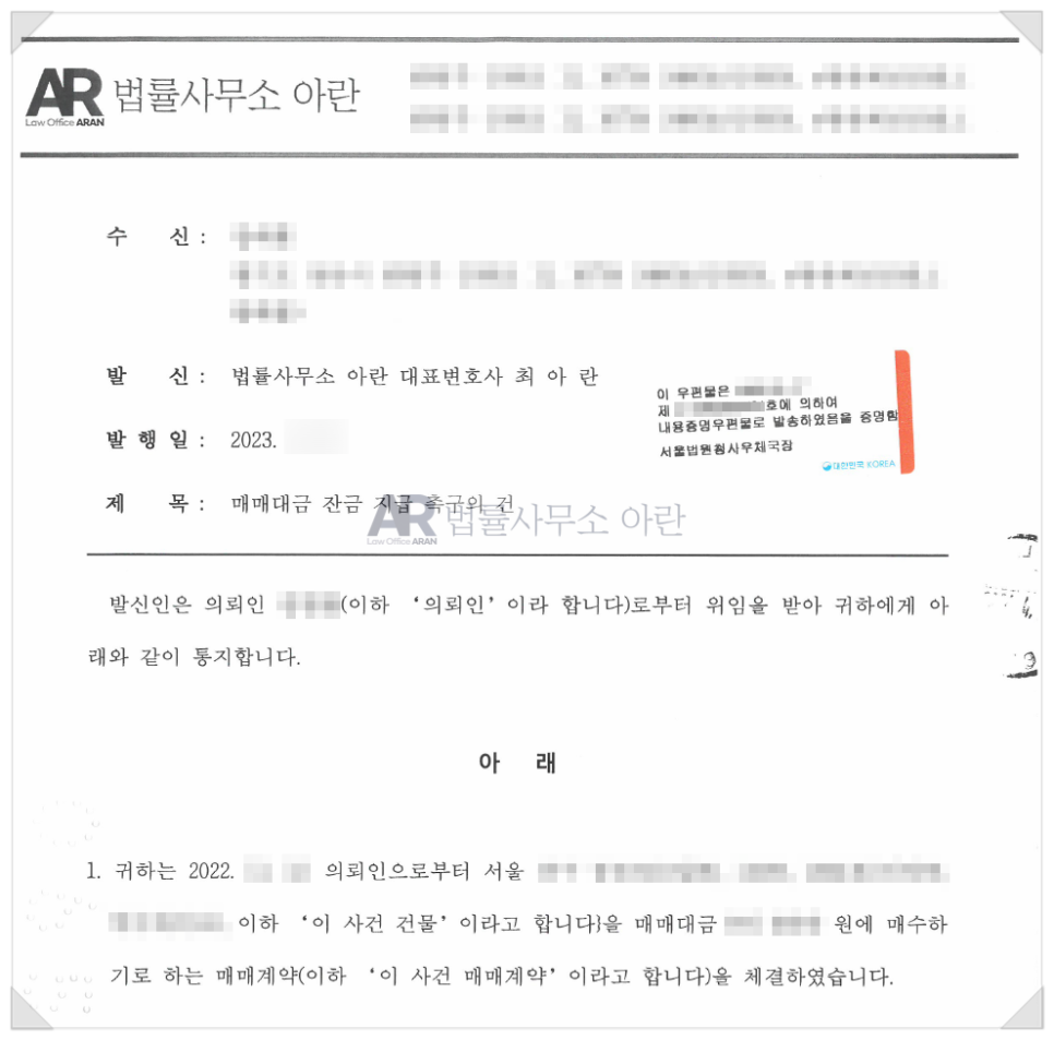 법률사무소 아란에서 실제로 발송한 내용증명 중 일부(매매대금 잔금 지급 촉구)